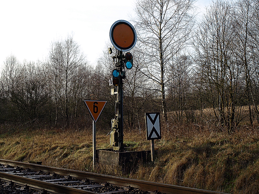 Das Einfahrvorsignal f aus Richtung Handeloh. In Analogie zum Einfahrsignal F fehlt der Zusatzflügel.